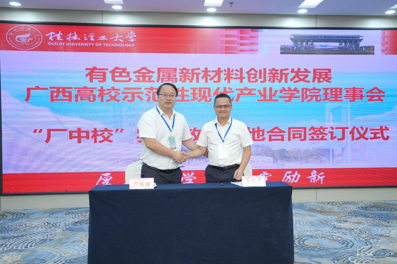 经前期协商,现代产业学院与广西金川有色金属有限公司、广西北港新材料有限公司、广西盛隆冶金有限公司、中国有色桂林矿产地质研究院有限公司、广西田东锦鑫化工有限公司、广西翅冀钢铁有限公司等6家企业达成合作协议,共建“厂中校”实践教学基地。会上,现代产业学院院长周焕福与“厂中校”实践教学基地代表-广西北港新材料有限公司签订“厂中校”实践教学基地合同。本科生院院长康志强为6家“厂中校“实践教学基地授牌。