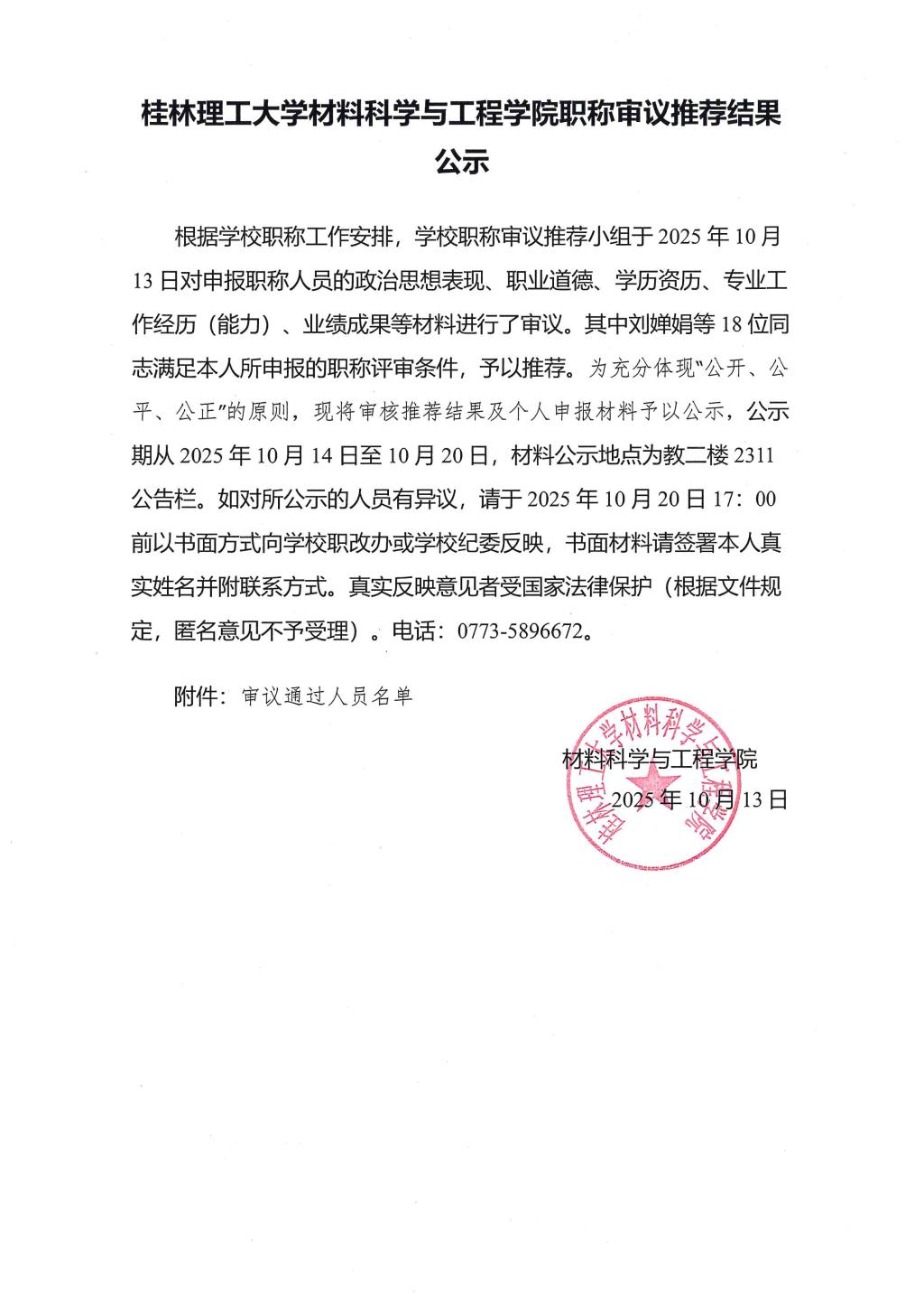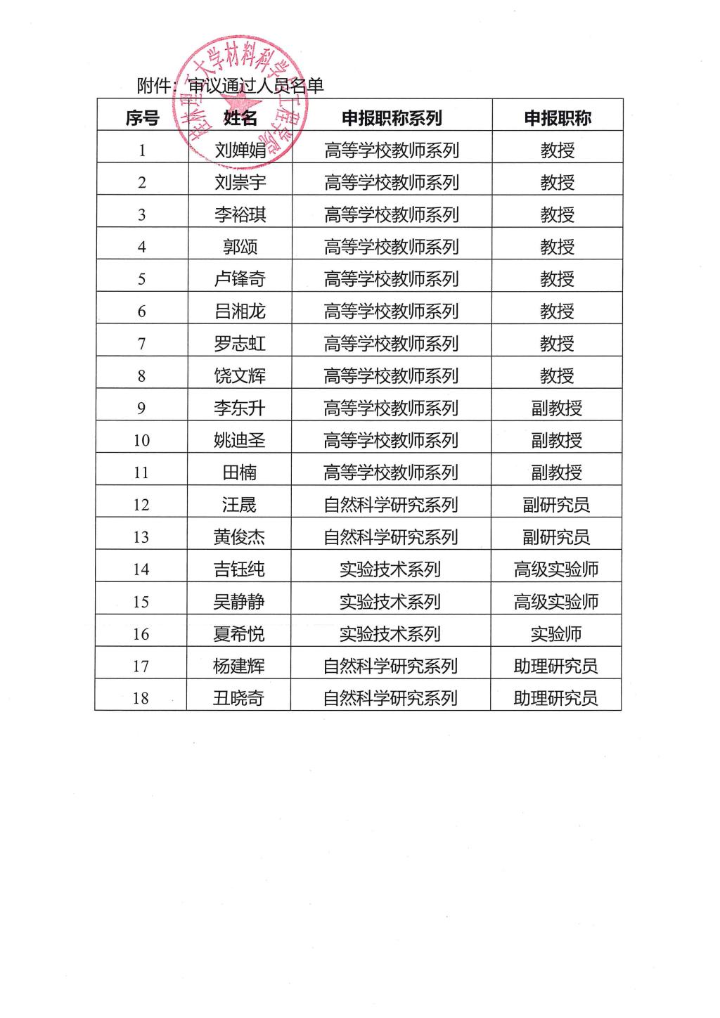 材料科学与工程学院2025年职称审议推荐结果公示