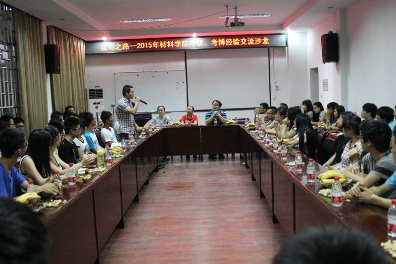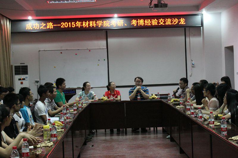 为了进一步提高我院学生的考研热情,明确考研目标,掌握相关考研技巧,了解更多考研信息,6月9日晚7:30,材料学院团委组织开展了“成功之路----2015年材料学院考研、考博经验交流沙龙”,沙龙邀请了学院今年考上武汉大学、中南大学、西南交大等名校的考研、考博达人代表作为分享嘉宾。学院党委副书记郑陈荣老师、院长助理周焕福老师、学工组长孙巍老师以及2012、2013级部分学生出席了此次活动。